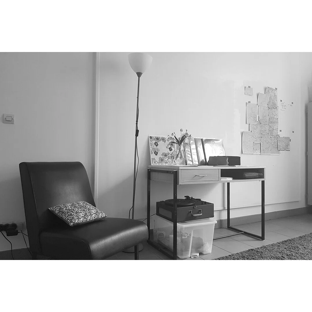 Studio residence of Joe and Chanelle. On the far right is a map of Europe charting the excursions to Art Museums. Each studio apartment is a one bedroom space with ample room for working, with small bathroom and kitchen. Centre, a locally sourced LP player and vinyls bought from Bad Boy Records, a punk record shop located in the Bastille area. Open Studios are a regular occurrence at the Cité, where artists showcase the fruits of their stay.