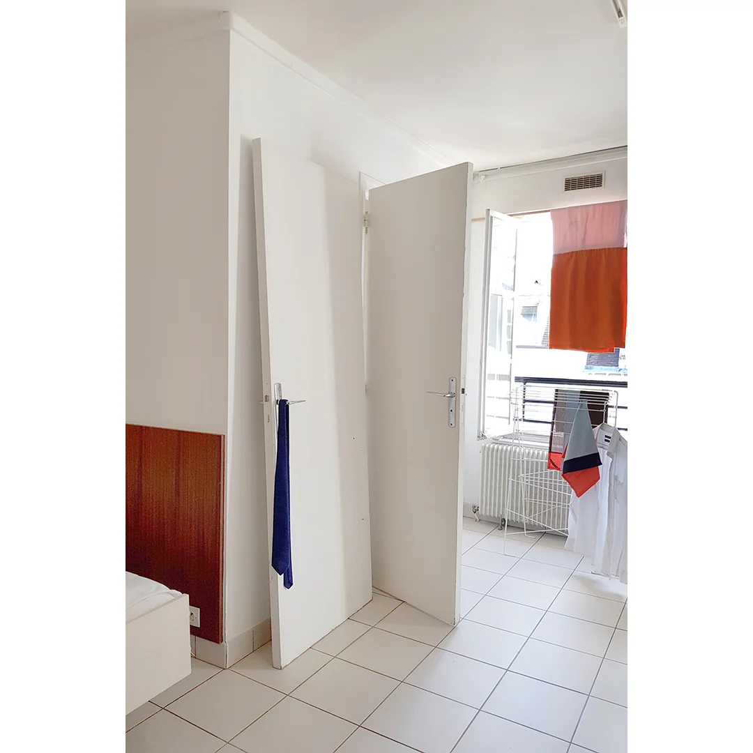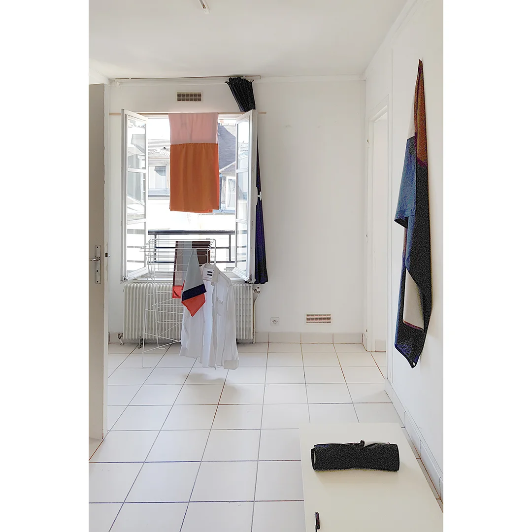 For Puncture, open studio 7th September, Joe Wilson & Chanelle Collier deliberately combined the function of their studio living space with its function as an atelier and makeshift gallery, through an aesthetic ordering of artworks and everyday objects within the Cité Interantionale des Arts apartment. The presentation was partly home décor in its significance to a sense of belonging and agency; and also, part territorialisation where hanging flags claimed the domain. Wilson & Collier utilise relational distinctions between art and life to think about boundaries, as border and threshold, to develop visual means that either punctuate or puncture these contextual frames.