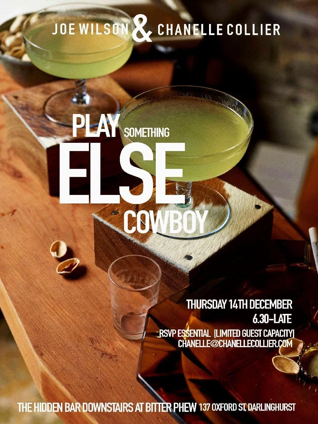 Play Something Else Cowboy is a site for participation, where the bar acts as a locus object, a meeting place. Conversation and cocktails facilitate a generative dialogue between peers, hosting 2 guests every Friday night at 6pm.