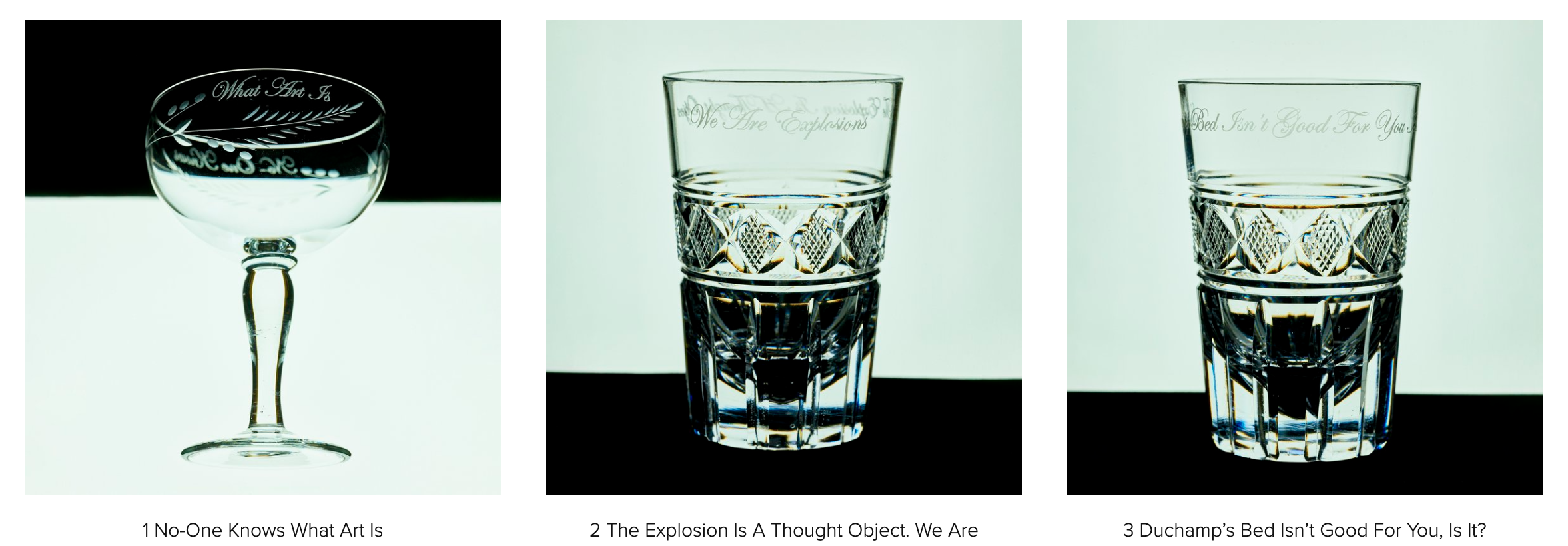 Accompanying Play Something Else Cowboy, is an ongoing series of cocktail glasses engraved with unattributed quotes from guests that reflect the quantity and diversity of engagement.