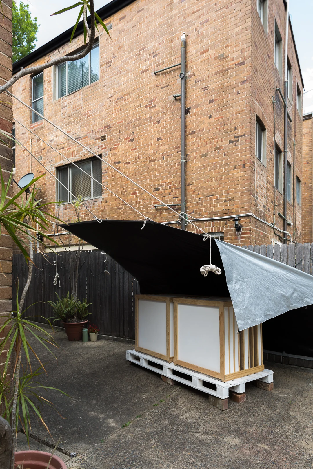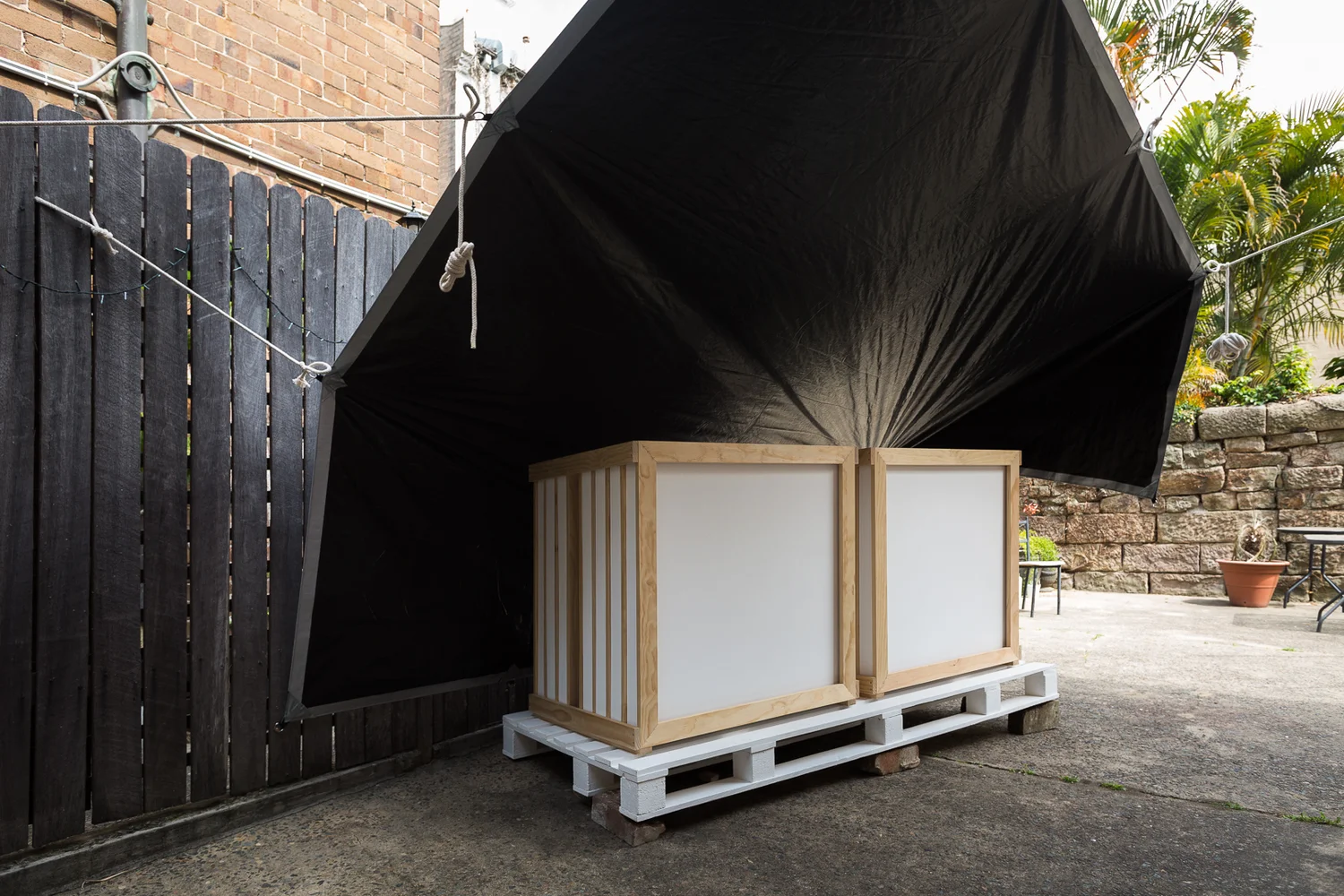 Bushman's Stockroom,  2017. 108 x 209 x 96cm. Timber, acrylic, polyester. ( Painting Rack w/ Tarpaulin )