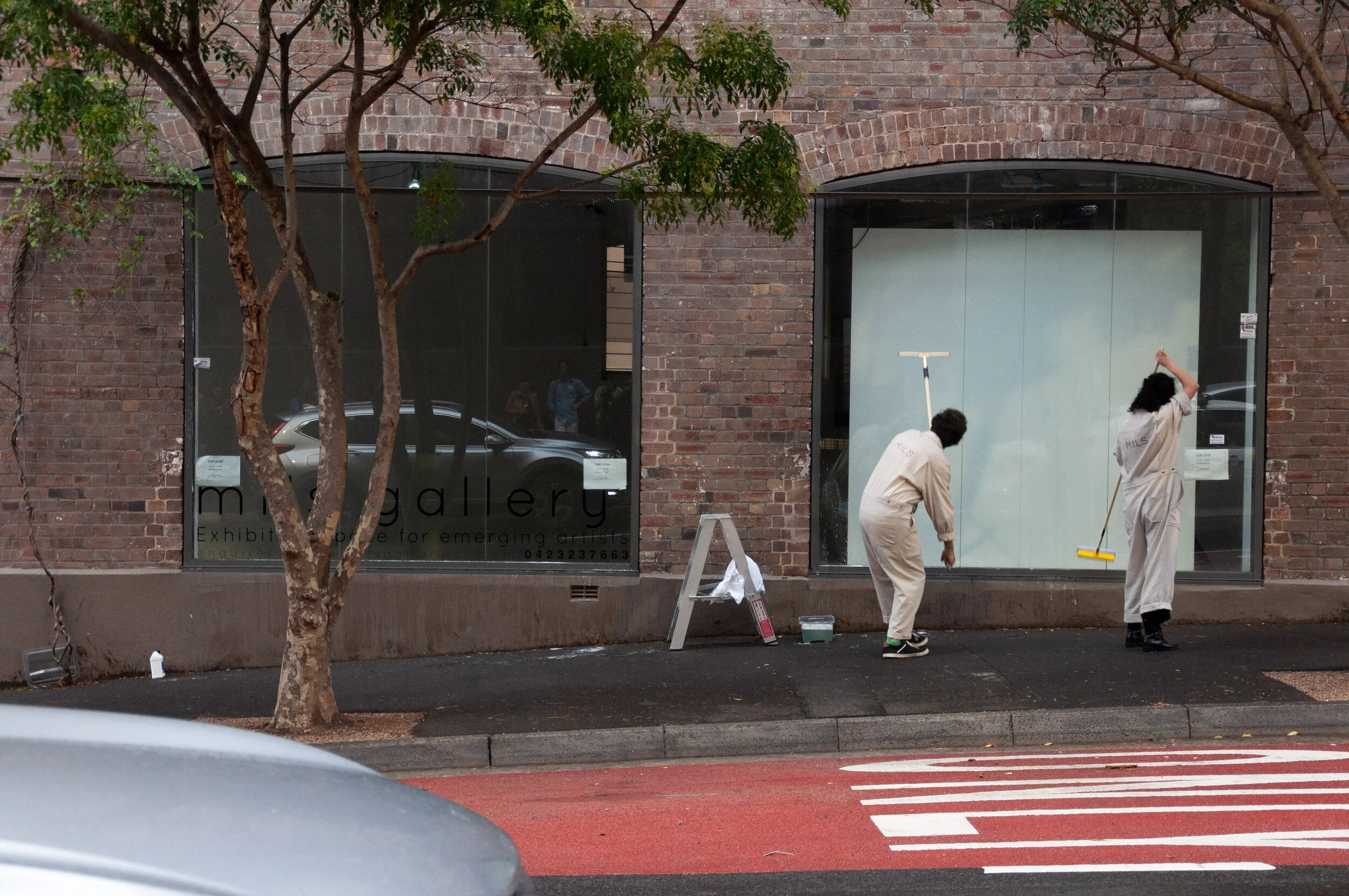 WITH ALL OUR LOVE by Joe and Chanelle features performative substitution-painting, live on the two street-side windows. Each artist, wearing a newly rebranded ‘Mils’ Uniform, cleans a window at 15 Randle St, Surry Hills, Sydney. Using window cleaner as a proxy pigment, and applying suds in an all-over gesture that is akin to painting, and then squeegeeing it off, Joe and Chanelle clean the windows. This as an act of tending and care by the artists dedicated to a gallery. The gesture highlights the reciprocal relationship had with an exhibition space.