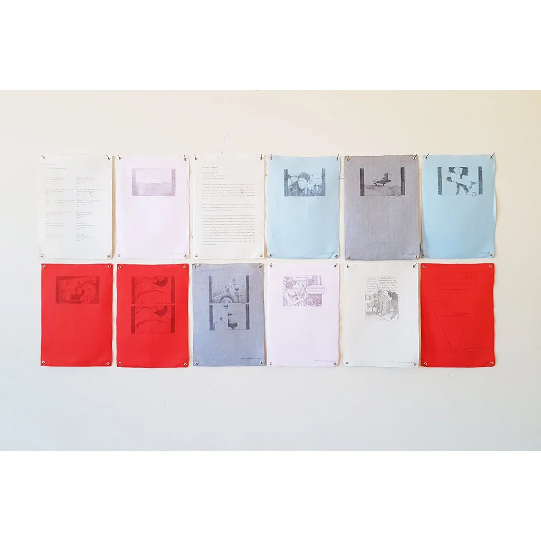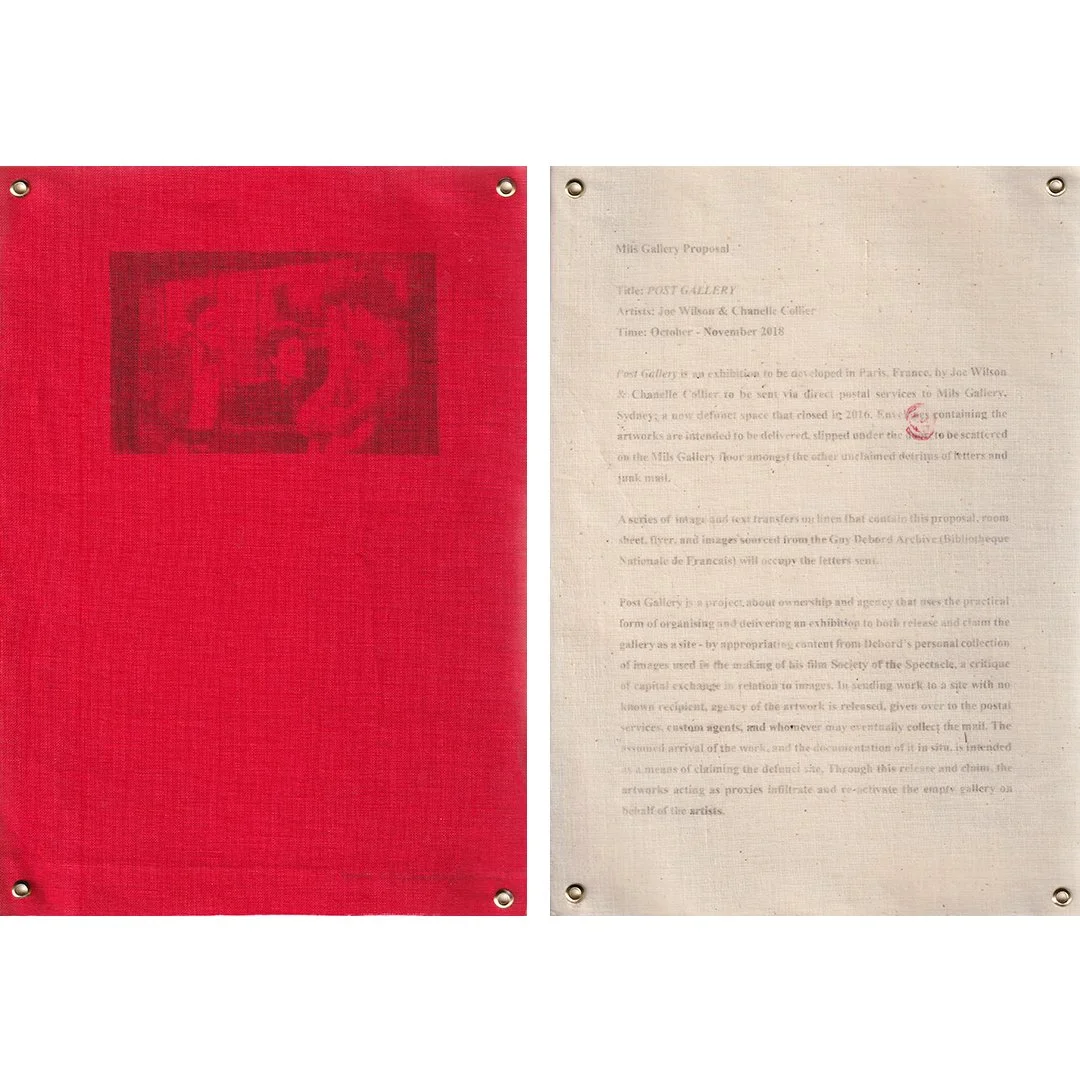 Developed as part of their Paris residency at the Cité Internationale des Arts, France, Joe Wilson & Chanelle Collier’s Post Gallery is an exhibition that travelled by mail to Mils Gallery, Sydney. Mils has been an abandoned space since it closed in late 2016. A series of 12 image and text transfers on linen have been sent by post to be slipped under the door, randomly scattered on the gallery floor amongst the other unclaimed detritus of letters and junk mail.